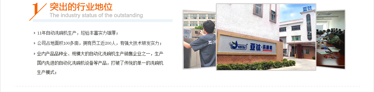 東莞市亞鈦?zhàn)詣?dòng)化科技有限公司位于珠三角經(jīng)濟(jì)中心地帶的東莞,享譽(yù)“世界工廠”之稱,東莞亞鈦?zhàn)詣?dòng)化科技有限公司是一家致力于商用洗碗機(jī)的研發(fā)、制造、項(xiàng)目投資運(yùn)營(yíng)管理一體化的高新技術(shù)企業(yè)。本公司率先引進(jìn)歐盟、日本等多家國(guó)際先進(jìn)技術(shù)及專業(yè)制作人才,使產(chǎn)品在生產(chǎn)工藝、產(chǎn)品質(zhì)量、洗滌效果等方面達(dá)到較高水平,形成了以物理處理為核心的產(chǎn)業(yè)化、集成化餐具清洗、消毒處理、包裝技術(shù),立足成為“商用洗碗機(jī)一體化運(yùn)作名牌企業(yè)”。